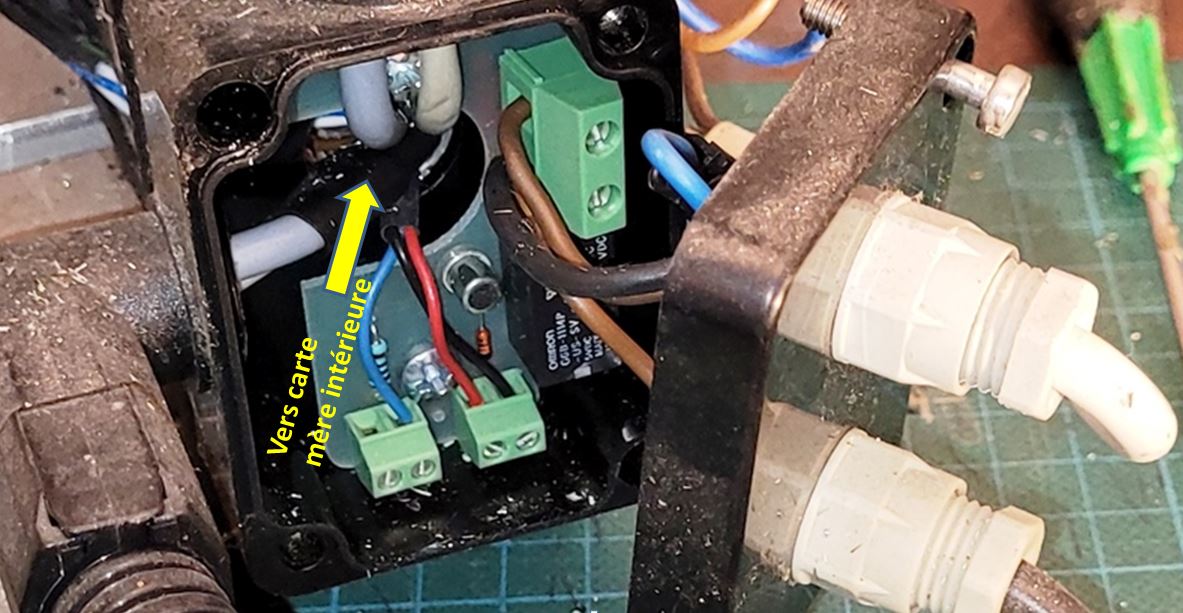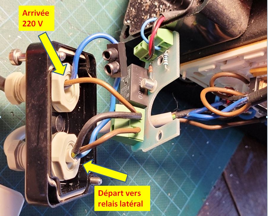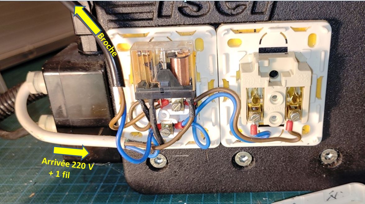 le 220 V, sans terre, traverse deux boîtiers où il est rejoint par un fil d'asservissement, avant de repartir avec 2 fils vers la broche.