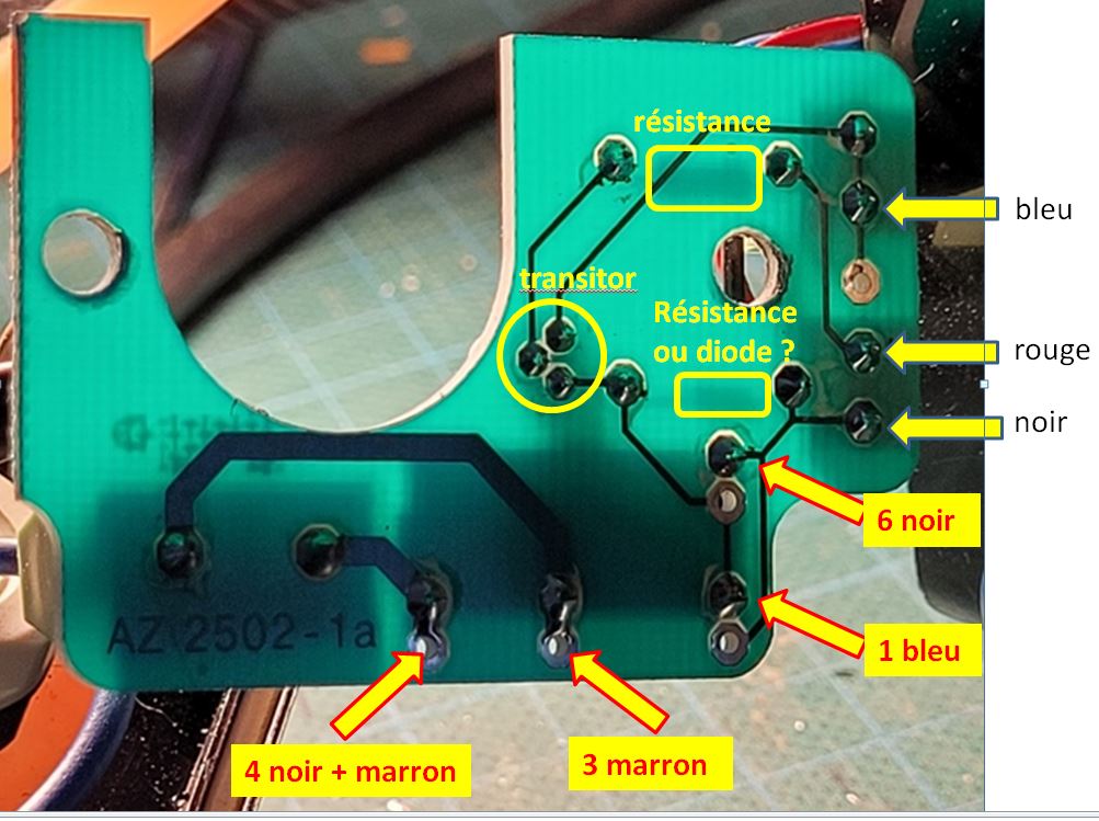 Voici quelques photos, certaines annotées, pour comprendre tout cela. On y voit aussi la réponse aux autres questions, concernant le câblage de la platine arrière (photographiée par transparence pour bien identifier les circuits) :