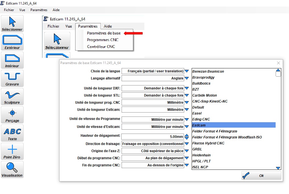 et ouvrir successivement les 3 sous-menus ; Dans les deux premiers il suffit de cliquer sur Estlcam, puis OK