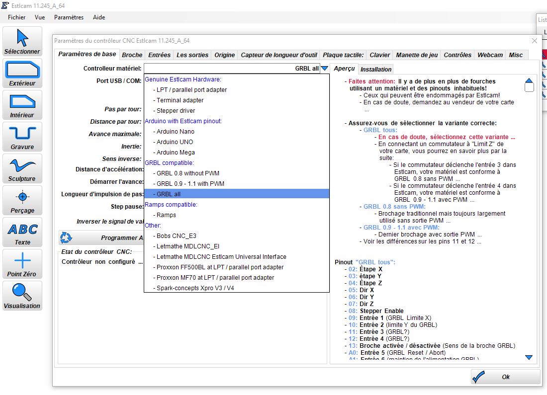 selon la configuration paramétrée Estlcam indique dans sa fenêtre de droite des affectations différentes des broches