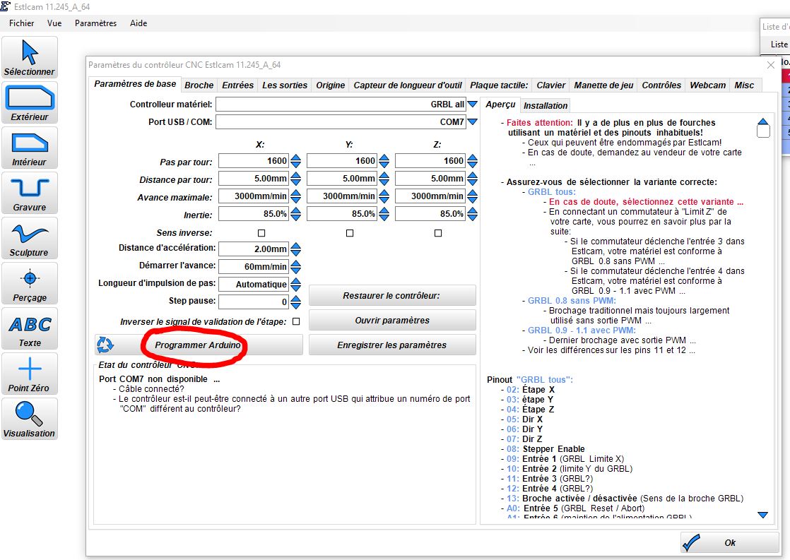 Donc, pour yoyo : pas besoin d'installer grbl sur la carte Arduino. C'est Estlcam qui installe son propre logiciel.