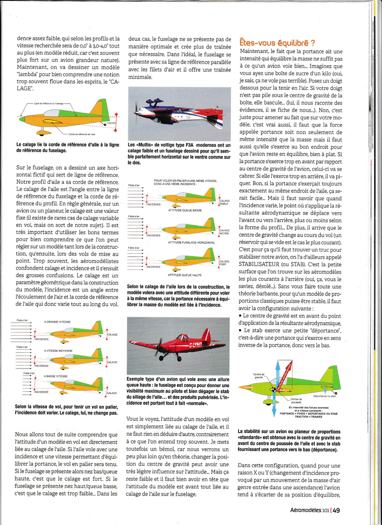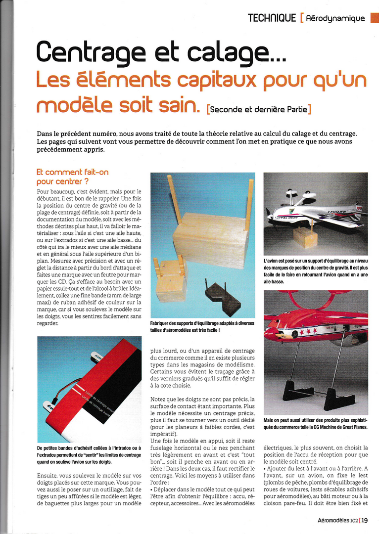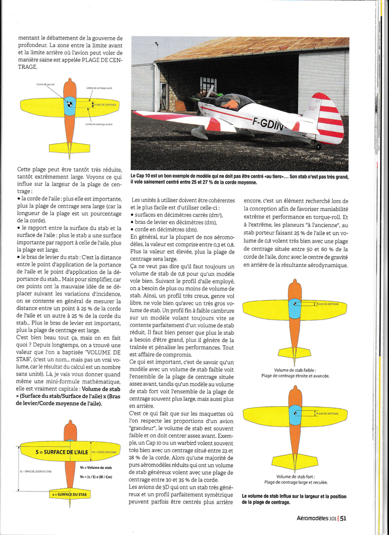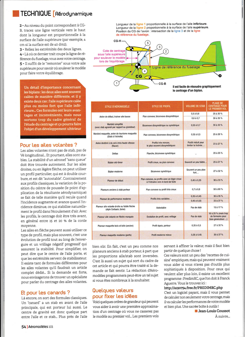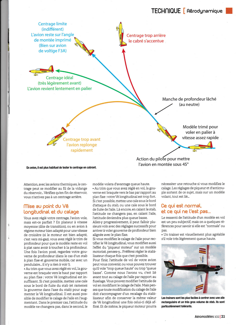 A lire et à relire (souvent...) et c'est ce que je vais faire dès que j'aurai retrouvé ma loupe .........C'est très bien expliqué, sans formules mathématiques fumeuses, et d'une façon très complète. Ca va faire grincer quelques dents car quelques idées reçues vont en prendre un bon coup........(queue basse, centré trop arrière par exemple .....) Il me semble qu'il y avait encore une page, à la fin, qui traitait de la notion de "volume de stab". Mais on peut faire sans, c'est utile surtout à ceux qui conçoivent leur modèle de A à Z.