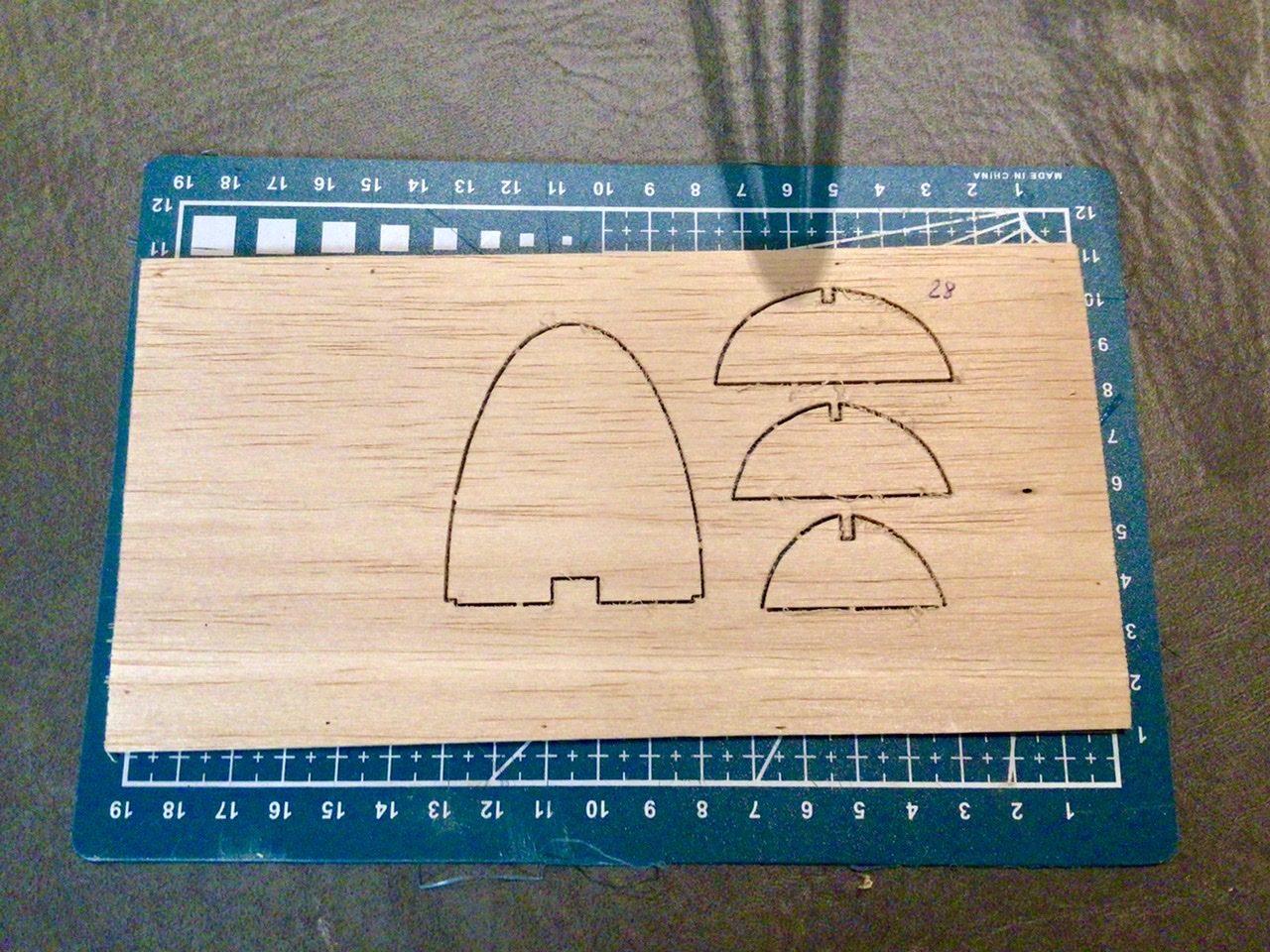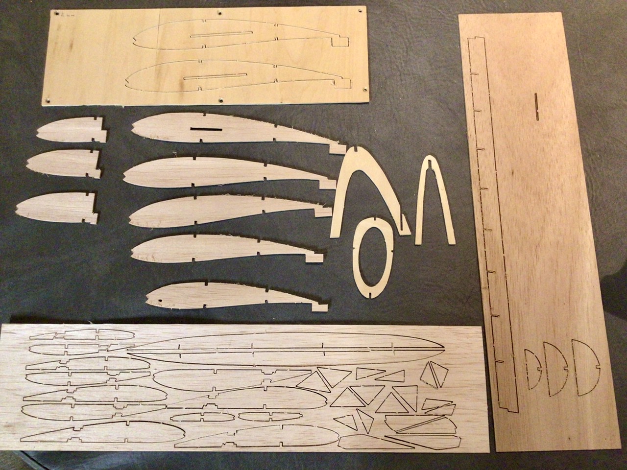 J’ai commencé la trappe, mais les couples dessinés par Alfred ne s’ajustaient plus très bien sur le fuselage réparé, après un essai infructueux pour les assembler, je les ai finalement redessinés et redécoupés. J’ai profité de découper un couple supplémentaire qui viendra derrière la cabine et qui permettra d’avoir de la matière pour verrouiller la trappe.