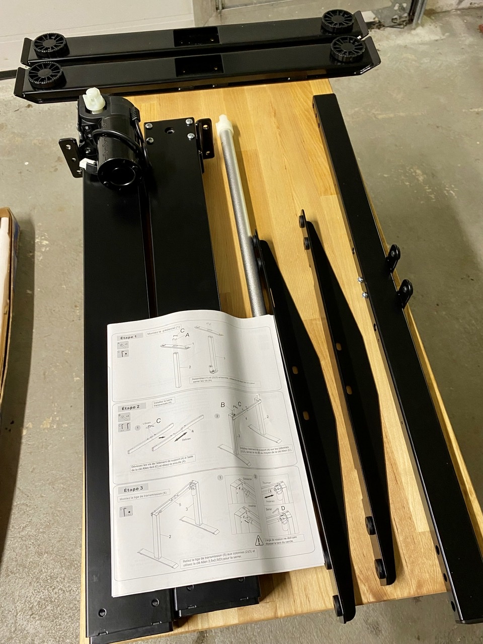 Ensuite, j’ai décidé qu’il était temps de trouver autre chose que le couvercle de mon spa pour installer mon chantier. J’ai donc acquis une mécanique de bureau réglable sur laquelle viendra installer mon plateau de travail, ce qui me permettra de travailler à la bonne hauteur et de préserver mon dos