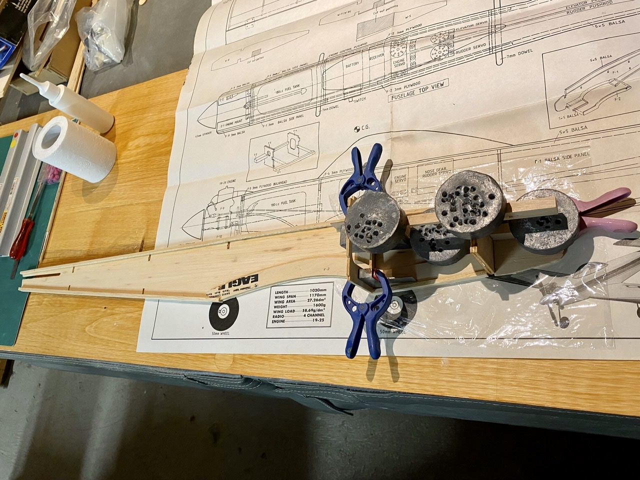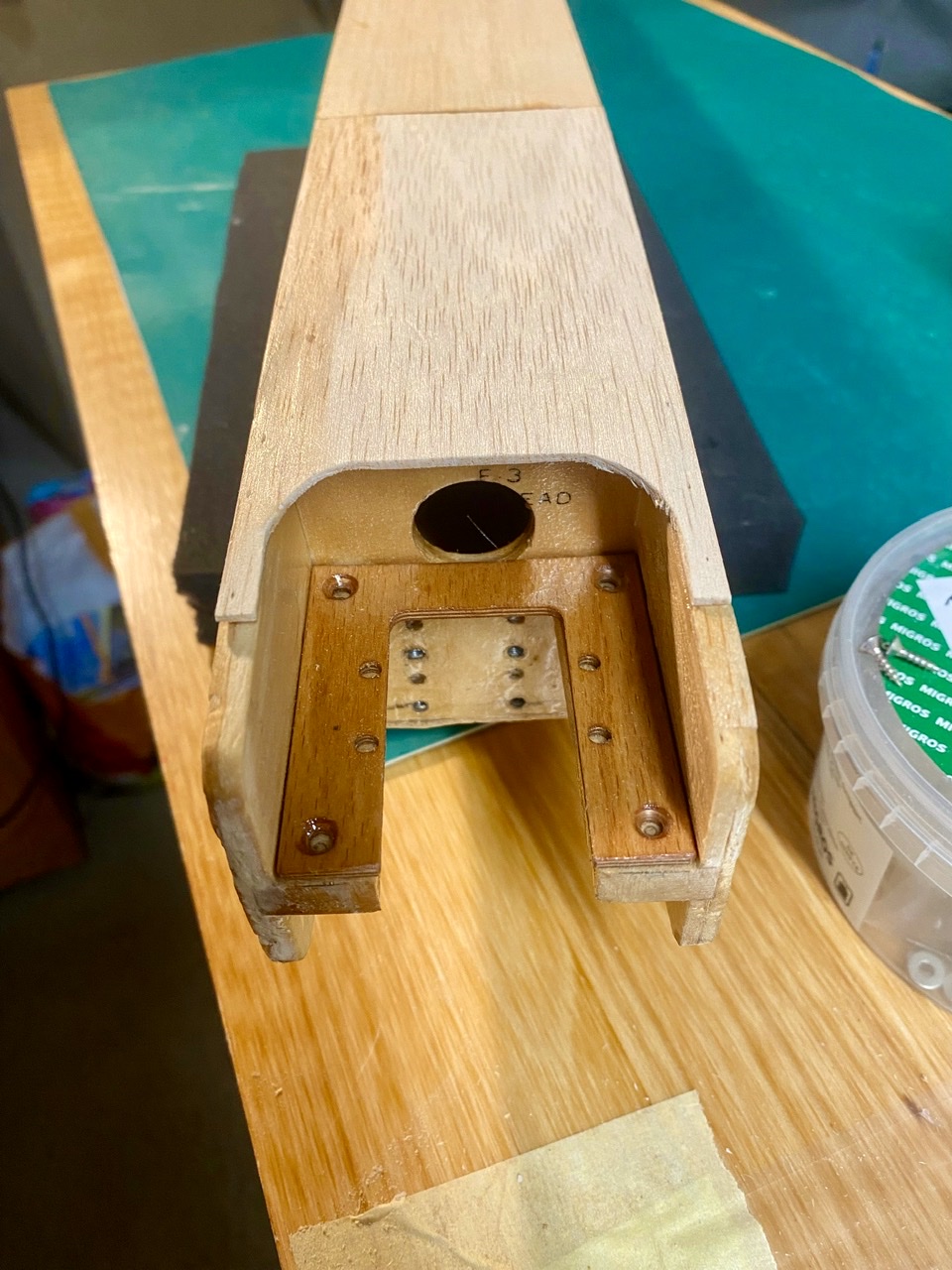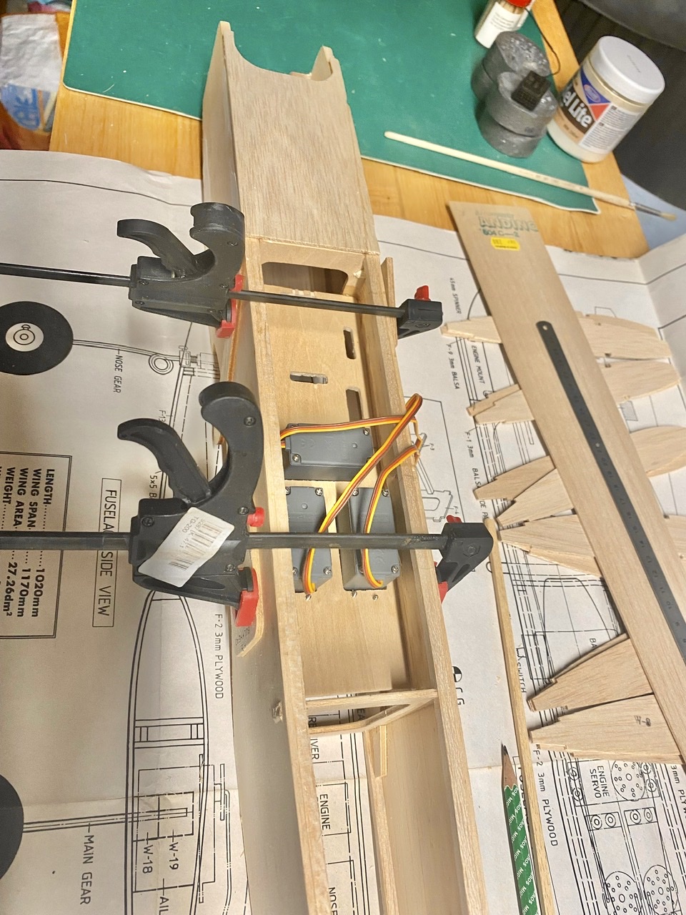 Et la construction au stade actuel avec le collage la structure formée par les deux premiers couples et le bâti moteur en bois.