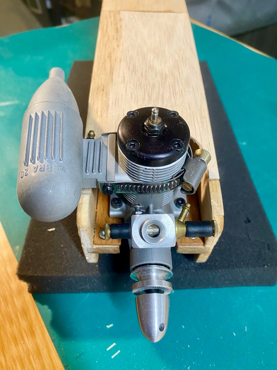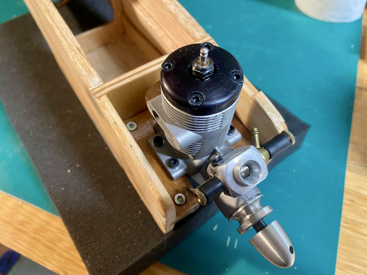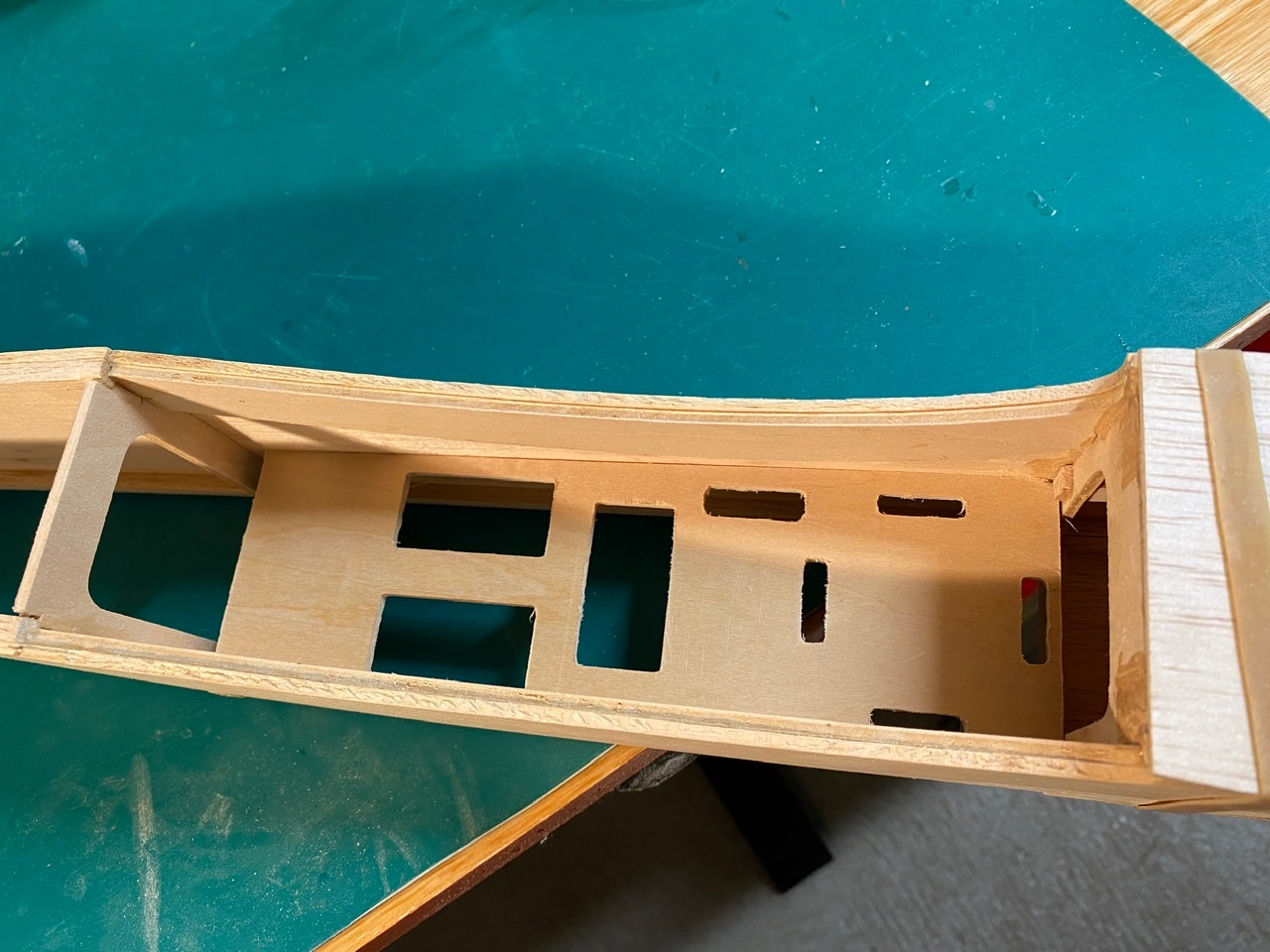 Et la construction au stade actuel avec le collage la structure formée par les deux premiers couples et le bâti moteur en bois.