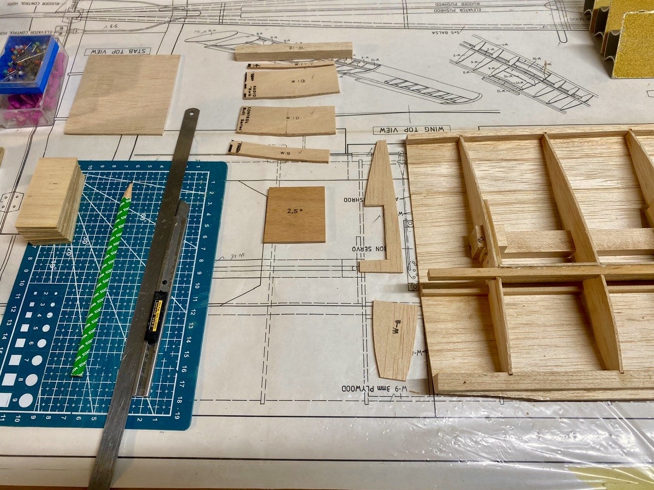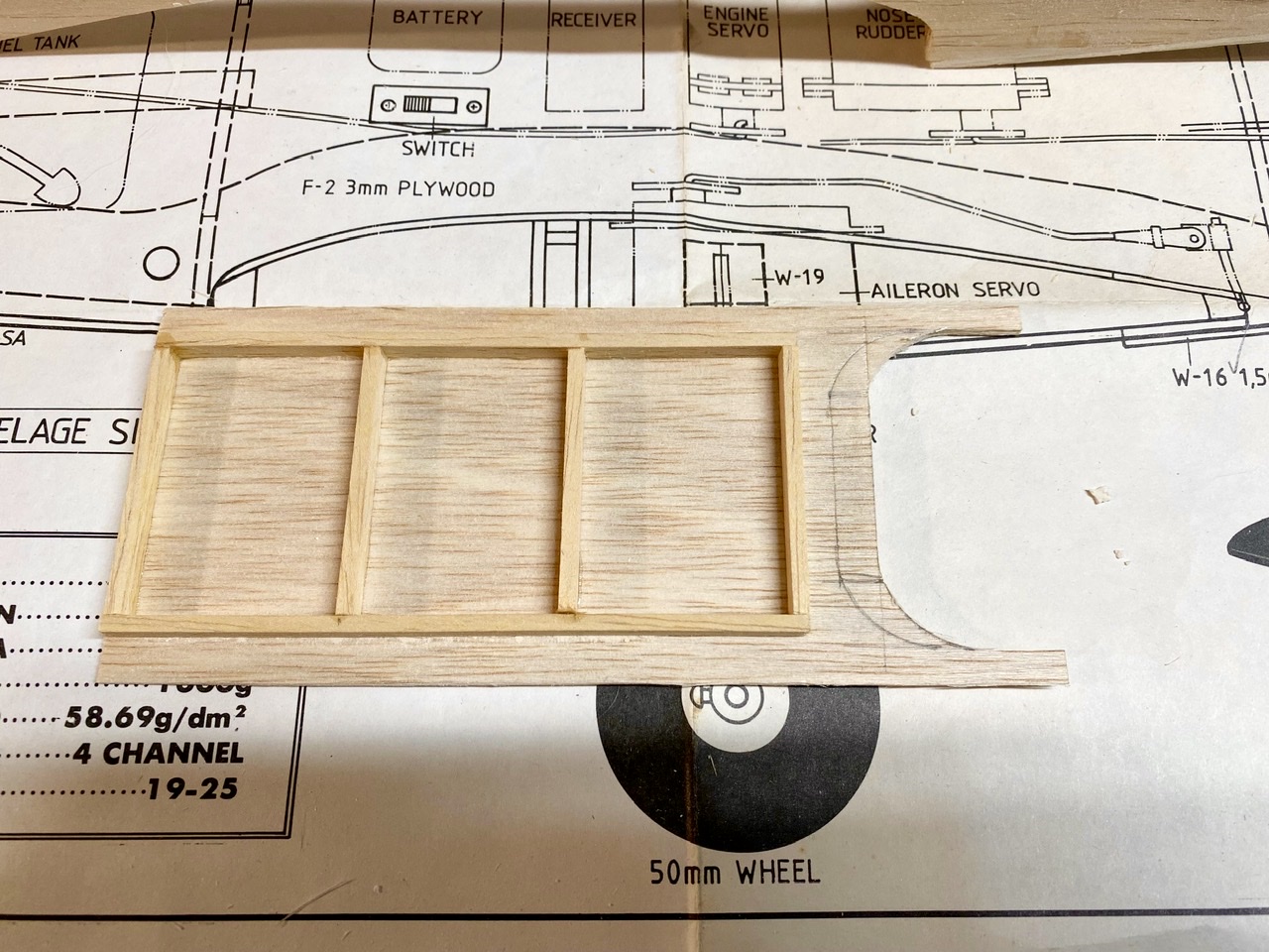 Du côté des défauts on notera une mauvaise qualité de découpes par étampage, à comparer avec le Cessna 172 Robbe, ce n’est vraiment pas terrible, la qualité du bois qui est plutôt dense et fibreux est également discutable. Autre point particulier, il n’y a pas de notice de montage, les assemblages les plus « complexes » sont justes indiqués sur des petites vignettes sur le plan.